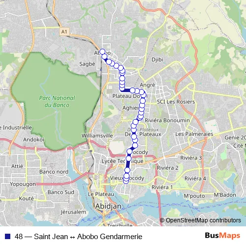 Bus 48 - Saint Jean ↔ Abobo Gendarmerie in Abidjan: Stops & Timetable