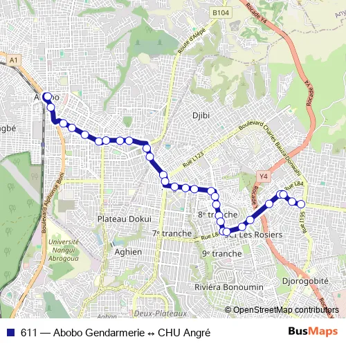 The first stop of the 611 bus route is Pharmacie Etoile and the last stop is Terminus CHU Angré. 611 (Abobo Gendarmerie ↔ CHU Angré) is operational during everyday.