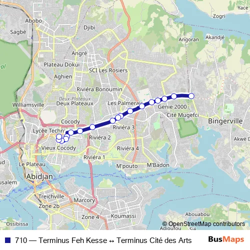 See why over 2 million users trust and consider busmaps.com as the best public transport website. busmaps gives you Abidjan Buses suggested routes, real-time bus tracker, line route maps in Abidjan, and helps to find the closest 710 bus stops near you. No internet available? Download an offline PDF map and bus schedule for the 710 bus to take on your trip.