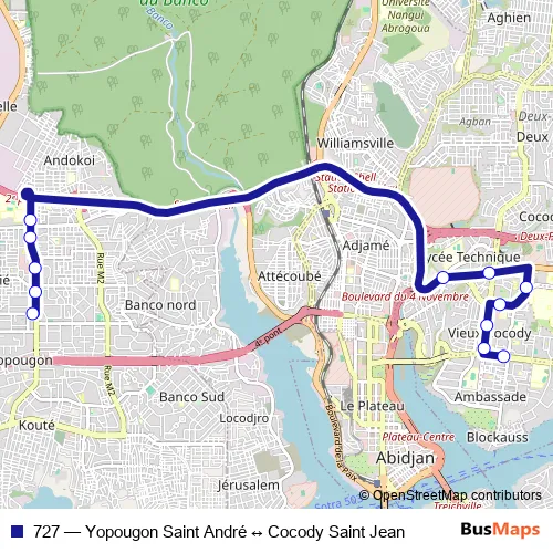The first stop of the 727 bus route is Marché Cocody and the last stop is Paroisse St André. 727 (Yopougon Saint André ↔ Cocody Saint Jean) is operational during everyday.