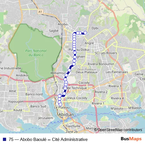 Bus 75 - Abobo Baoulé ↔ Cité Administrative Schedule in Abidjan