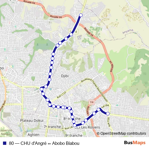 The first stop of the 80 bus route is Terminus CHU Angré and the last stop is Terminus Djibi Village. 80 (CHU d'Angré ↔ Abobo Biabou) is operational during everyday.