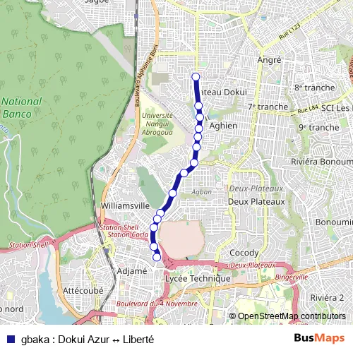 Additional information: gbaka : Dokui Azur ↔ Liberté has 14 stops and the total trip duration
