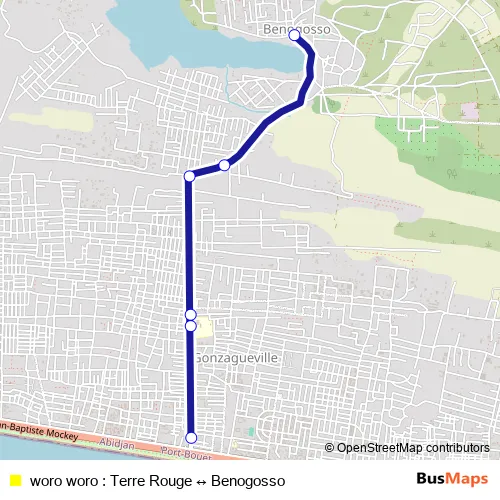 See why over 2 million users trust and consider busmaps.com as the best public transport website. busmaps gives you Abidjan Buses suggested routes, real-time bus tracker, line route maps in Abidjan, and helps to find the closest woro woro : Terre Rouge ↔ Benogosso bus stops near you. No internet available? Download an offline PDF map and bus schedule for the woro woro : Terre Rouge ↔ Benogosso bus to take on your trip.