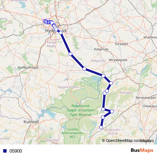 RC Puram BHEL - Beeramguda Rd Mumbai Highway - Chandanagar - RC Puram BHEL Rd Mumbai Highway - Allwyn - Gangaram Road Mumbai Highway - Miyapur - Allwyn Cross Road Mumbai Highway - Nizampet - Miyapur Road Mumbai Highway - Service Road - Mumbai Highway - Sanjeeva Reddy Nagar Main Road - Ameerpet Road - Panjagutta Main Road - Telephone Bhavan Road - Hyderabad - Nagarjuna Sagar Road - Tripuranthakam Main Road - NH765;NH565;NH544D;NH544F - APSRTC Bus Station Inner Road