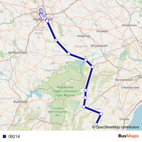 Jeedimetla Main Road - Balanagar Cross Road - Mumbai Highway - Sanjeeva Reddy Nagar Main Road - Ameerpet Road - Panjagutta Main Road - Telephone Bhavan Road - Vijaywada Highway - Hyderabad - Nagarjuna Sagar Road - NH765;NH565;NH544D;NH544F - APSRTC Bus Station Inner Road - Ongole - Nandyal Road