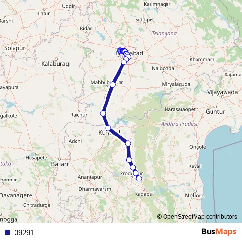 RC Puram BHEL - Beeramguda Rd Mumbai Highway - Chandanagar - RC Puram BHEL Rd Mumbai Highway - Allwyn - Gangaram Road Mumbai Highway - Miyapur - Allwyn Cross Road Mumbai Highway - Nizampet - Miyapur Road Mumbai Highway - Service Road - Mumbai Highway - Sanjeeva Reddy Nagar Main Road - Ameerpet Road - Panjagutta Main Road - Telephone Bhavan Road - New Bus Stand Road - Allagadda Main Road - Chagalamarri Main Road - Duvvuru Main Road - Mydukuru Main Road