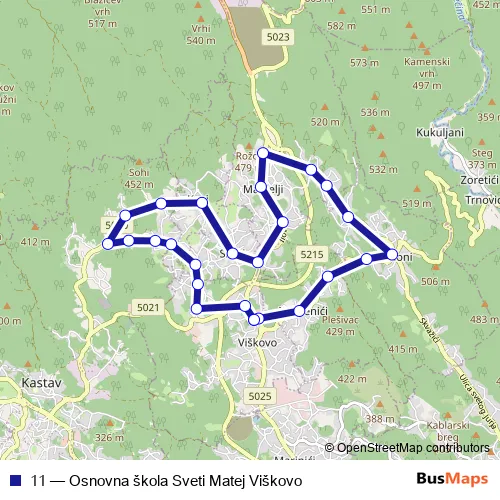 The first stop of the 11 bus route is Viškovo škola Sv.Matej and the last stop is Viškovo škola Sv.Matej. 11 (Osnovna škola Sveti Matej Viškovo) is operational during on weekdays.