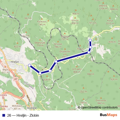 The first stop of the 26 bus route is Hreljin 7 Fister and the last stop is Zlobin 3 okretište. 26 (Hreljin - Zlobin) is operational during on weekdays.