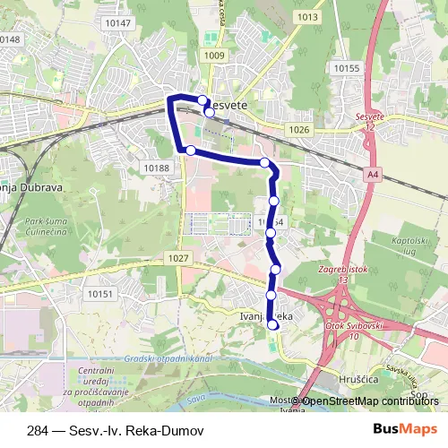 The first stop of the 284 bus route is Sesvete-ukrcaj and the last stop is Ivanja Reka-okret.. 284 (Sesv.-Iv. Reka-Dumov) is operational during everyday.