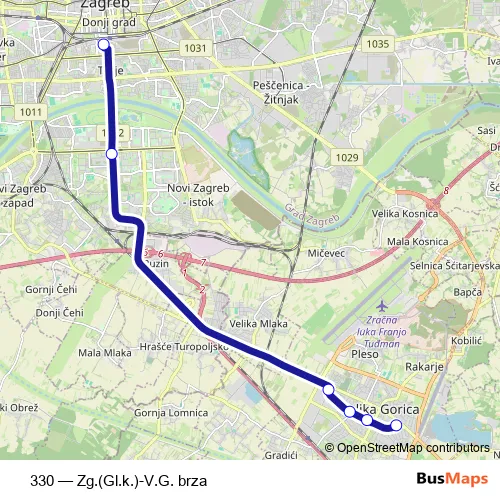 The first stop of the 330 bus route is Glavni kolodvor and the last stop is Velika Gorica. 330 (Zg.(Gl.k.)-V.G. brza) is operational during on weekdays.