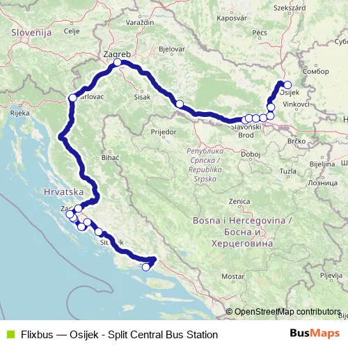 The first stop of the Flixbus bus route is Split Central Bus Station and the last stop is Osijek Bus Station. Flixbus (Osijek - Split Central Bus Station) is operational during everyday.