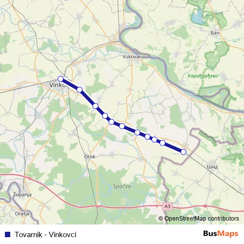 The first stop of the Tovarnik - Vinkovci rail route is Tovarnik and the last stop is Vinkovci. Tovarnik - Vinkovci (Tovarnik - Vinkovci) is operational during everyday.