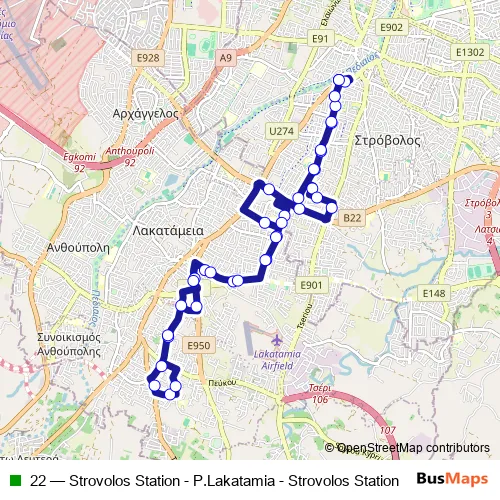 The first stop of the 22 bus route is Strovolos Station and the last stop is Strovolos Station. 22 (Strovolos Station - P.Lakatamia - Strovolos Station) is operational during everyday.