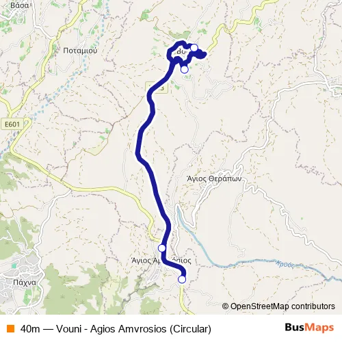 The first stop of the 40m bus route is Pano Kyvides - Agios Amvrosios Road and the last stop is Agios Efraim Church 2. 40m (Vouni - Agios Amvrosios (Circular)) is operational during on weekdays.