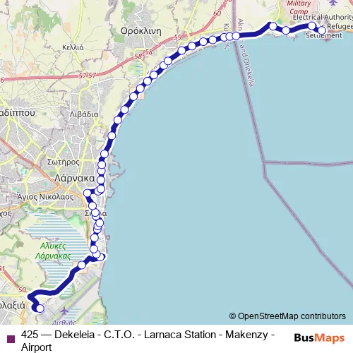 The first stop of the 425 bus route is Larnaka Airport and the last stop is Dekeleia Power Station 1. 425 (Dekeleia - C.T.O. - Larnaca Station - Makenzy - Airport) is operational during everyday.