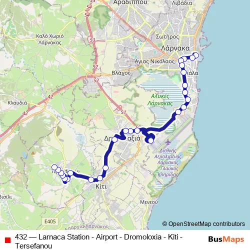 The first stop of the 432 bus route is Larnaca Station and the last stop is Trion Ierarchon - Stadio. 432 (Larnaca Station - Airport - Dromoloxia - Kiti - Tersefanou) is operational during everyday.