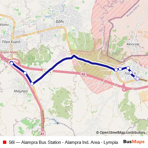 The first stop of the 56l bus route is Alampra Bus Station and the last stop is Agios Epifanios Church 1. 56l (Alampra Bus Station - Alampra Ind. Area - Lympia) is operational during on weekdays.