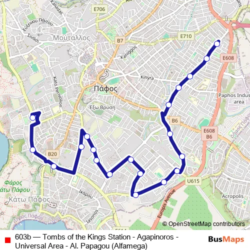 The first stop of the 603b bus route is Stratigou Alex. Papagou - Andrea Theodosiou and the last stop is Tombs of the Kings Bus Station. 603b (Tombs of the Kings Station - Agapinoros - Universal Area - Al. Papagou (Alfamega)) is operational during everyday.