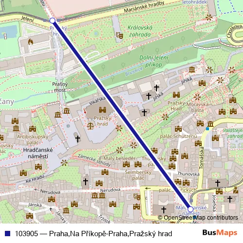 The first stop of the 103905 bus route is Praha,Malostranské náměstí and the last stop is Praha,Pražský hrad. 103905 (Praha,Na Příkopě-Praha,Pražský hrad) is operational during everyday.