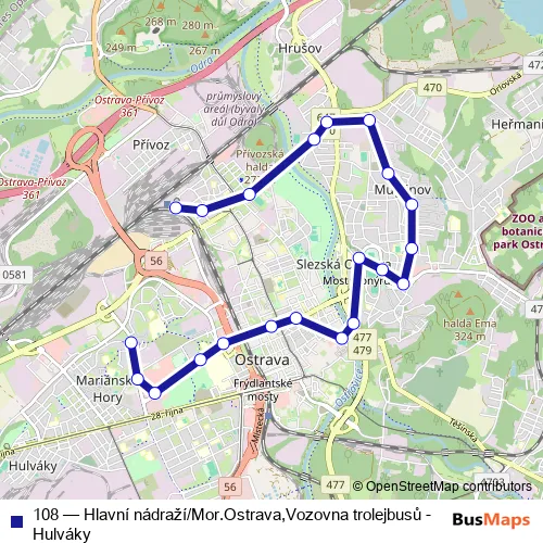 Click here to view the nearest 108 - Hlavní nádraží/Mor.Ostrava,Vozovna trolejbusů - Hulváky trolleybus stop.