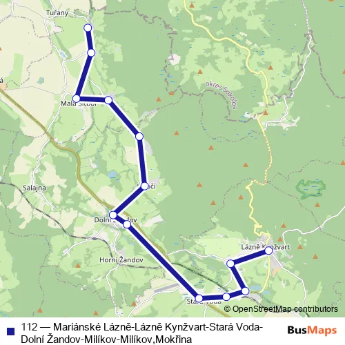 The first stop of the 112 bus route is Milíkov, Mokřina and the last stop is Lázně Kynžvart, autobusová stanice. 112 (Mariánské Lázně-Lázně Kynžvart-Stará Voda-Dolní Žandov-Milíkov-Milíkov,Mokřina) is operational during everyday.