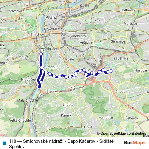 The first stop of the 118 bus route is Smíchovské nádraží and the last stop is Sídliště Spořilov. 118 (Smíchovské nádraží - Depo Kačerov - Sídliště Spořilov) is operational during everyday.