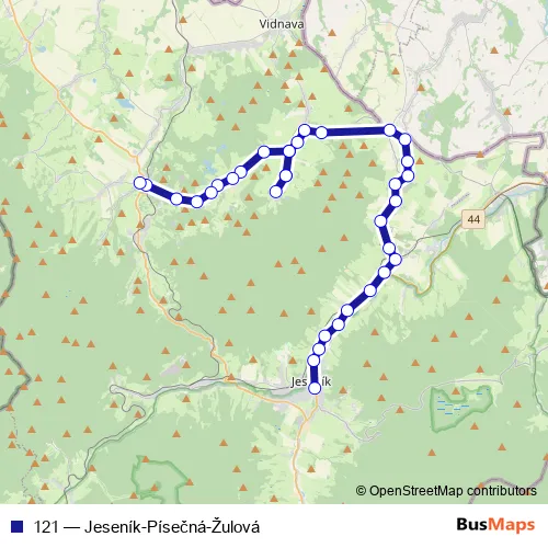 The first stop of the 121 bus route is Jeseník, autobusové nádraží and the last stop is Žulová, autobusová stanice. 121 (Jeseník-Písečná-Žulová) is operational during everyday.