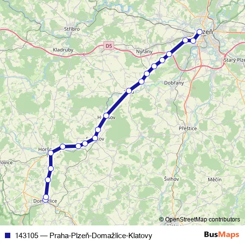 Click here to view the nearest 143105 - Praha-Plzeň-Domažlice-Klatovy bus stop.