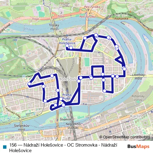 The first stop of the 156 bus route is Nádraží Holešovice and the last stop is Nádraží Holešovice. 156 (Nádraží Holešovice - OC Stromovka - Nádraží Holešovice) is operational during on weekdays.