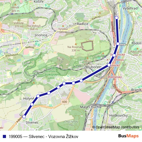 The first stop of the 199005 tram route is Praha,Slivenec and the last stop is Praha,Smíchovské nádraží. 199005 (Slivenec - Vozovna Žižkov) is operational during everyday.