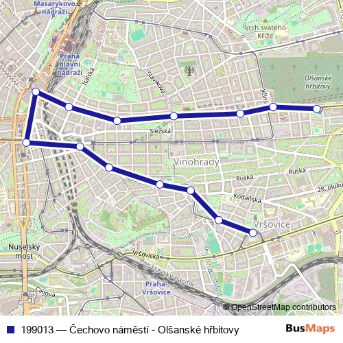 The first stop of the 199013 tram route is Praha,Olšanské hřbitovy and the last stop is Praha,Čechovo náměstí. 199013 (Čechovo náměstí - Olšanské hřbitovy) is operational during everyday.