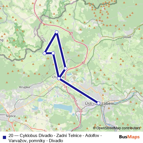 Ústí nad Labem, Divadlo. 20 (Cyklobus Divadlo - Zadní Telnice - Adolfov - Varvažov, pomníky - Divadlo) is operational during on weekends.