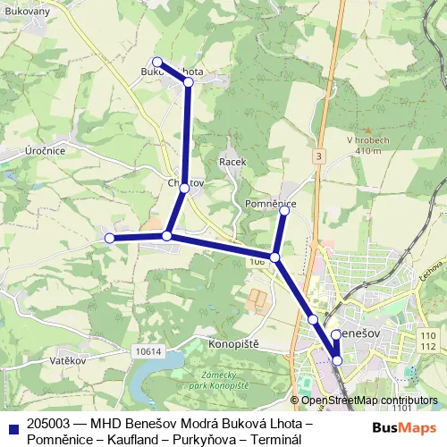 The first stop of the 205003 bus route is Benešov,Buková Lhota and the last stop is Benešov,Dukelská. 205003 (MHD Benešov Modrá Buková Lhota – Pomněnice – Kaufland – Purkyňova – Terminál) is operational during on weekdays.