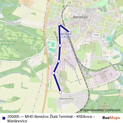 The first stop of the 205005 bus route is Benešov,Terminál and the last stop is Benešov,Mariánovice,Čsad. 205005 (MHD Benešov Žlutá Terminál – Křižíkova – Mariánovice) is operational during on weekdays.
