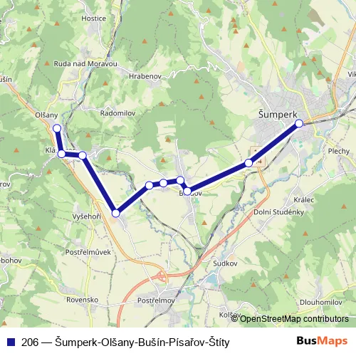 The first stop of the 206 bus route is Šumperk, autobusová stanice and the last stop is Olšany, záv.. 206 (Šumperk-Olšany-Bušín-Písařov-Štíty) is operational during everyday.