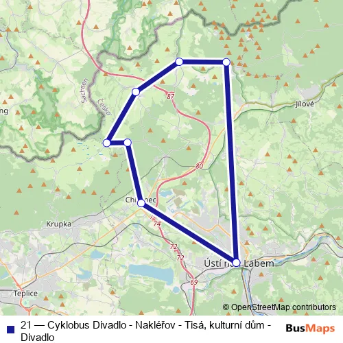 Ústí nad Labem, Divadlo. 21 (Cyklobus Divadlo - Nakléřov - Tisá, kulturní dům - Divadlo) is operational during on weekends.