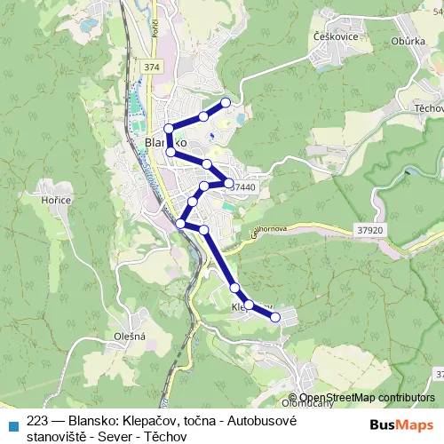 The first stop of the 223 bus route is Blansko, Klepačov, točna and the last stop is Blansko, Sever. 223 (Blansko: Klepačov, točna - Autobusové stanoviště - Sever - Těchov) is operational during everyday.