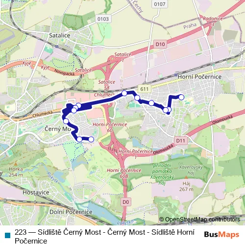 The first stop of the 223 bus route is Sídliště Horní Počernice and the last stop is Sídliště Černý Most. 223 (Sídliště Černý Most - Černý Most - Sídliště Horní Počernice) is operational during everyday.