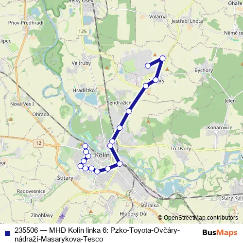 The first stop of the 235506 bus route is Kolín,Pzko-Toyota and the last stop is Kolín,Tesco. 235506 (MHD Kolín linka 6: Pzko-Toyota-Ovčáry-nádraží-Masarykova-Tesco) is operational during on weekdays.