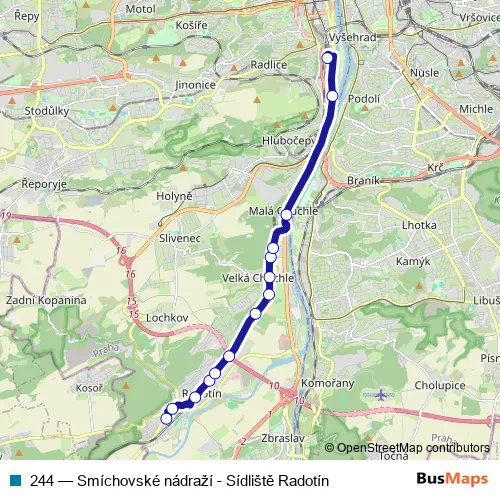 The first stop of the 244 bus route is Sídliště Radotín and the last stop is Smíchovské nádraží. 244 (Smíchovské nádraží - Sídliště Radotín) is operational during everyday.