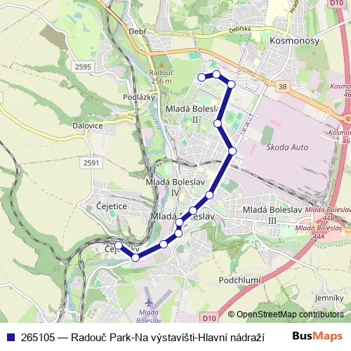 The first stop of the 265105 bus route is Mladá Boleslav,hl.nádr. and the last stop is Mladá Boleslav,Radouč Park. 265105 (Radouč Park-Na výstavišti-Hlavní nádraží) is operational during on weekdays.