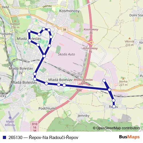 The first stop of the 265130 bus route is Řepov,prodejna and the last stop is Řepov,prodejna. 265130 (Řepov-Na Radouči-Řepov) is operational during on weekdays.
