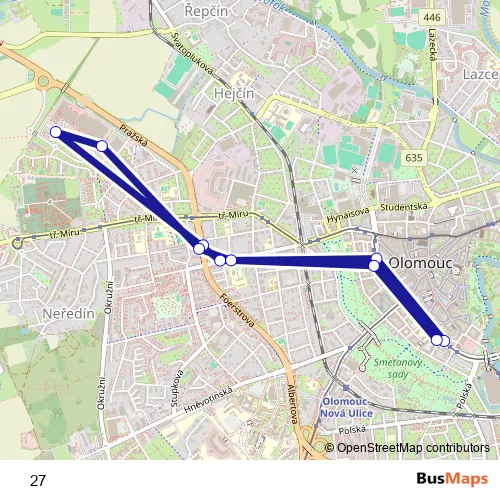 See why over 2 million users trust and consider busmaps.com as the best public transport website. busmaps gives you Olomouc Buses suggested routes, real-time bus tracker, line route maps in Olomouc, and helps to find the closest 27 bus stops near you. No internet available? Download an offline PDF map and bus schedule for the 27 bus to take on your trip.