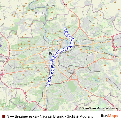 The first stop of the 3 tram route is Vozovna Kobylisy and the last stop is Nádraží Braník. 3 (Březiněveská - Nádraží Braník - Sídliště Modřany) is operational during everyday.