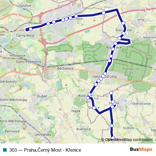 Bus 303 - Praha,Černý Most - Křenice in Prague: Stops & Timetable