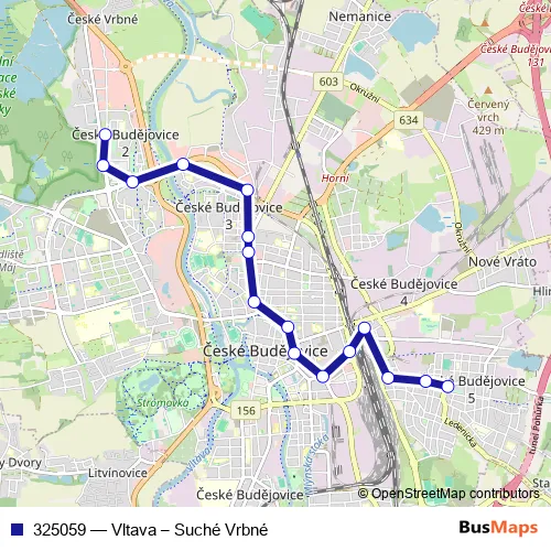 The first stop of the 325059 trolleybus route is České Budějovice, Vltava and the last stop is České Budějovice, Suché Vrbné. 325059 (Vltava – Suché Vrbné) is operational during everyday.
