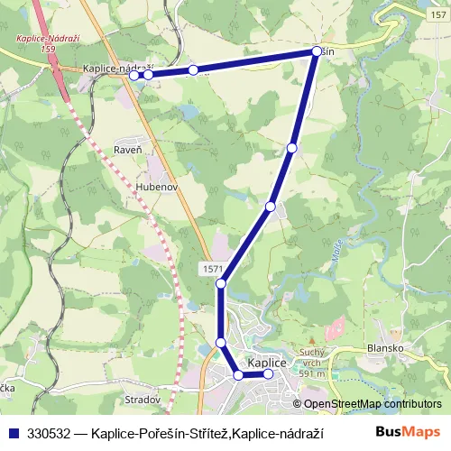 Click here to view the nearest 330532 - Kaplice-Pořešín-Střítež,Kaplice-nádraží bus stop.
