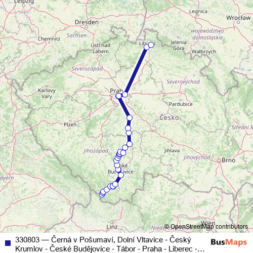 The first stop of the 330803 bus route is Černá v Pošumaví,Dolní Vltavice and the last stop is Bedřichov,stadion. 330803 (Černá v Pošumaví, Dolní Vltavice - Český Krumlov - České Budějovice - Tábor - Praha - Liberec - Bedřichov) is operational during everyday.