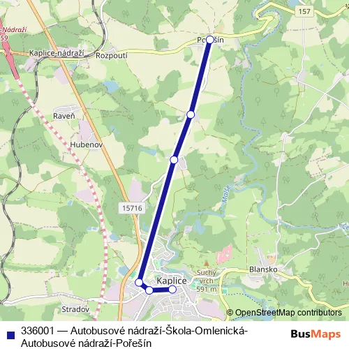 The first stop of the 336001 bus route is Kaplice,Pořešín,Ii and the last stop is Kaplice,aut.nádr.. 336001 (Autobusové nádraží-Škola-Omlenická-Autobusové nádraží-Pořešín) is operational during on weekdays.